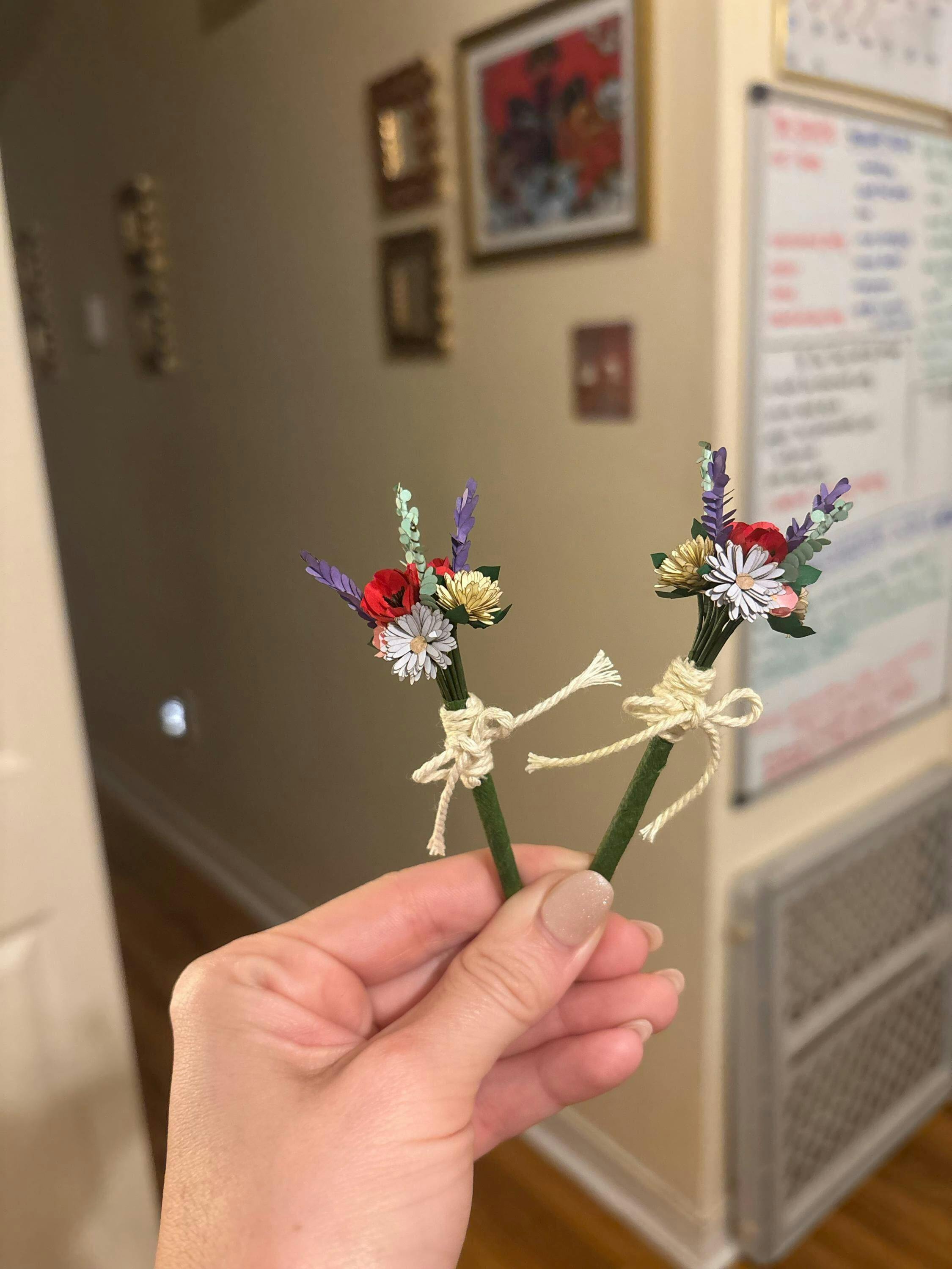 Panache's Mini Paper Variety Bouquets make an adorable gift topper, keepsake, pin, or a whimsical knickknack -- featuring red poppies, pale yellow mums, blue or purple gerbera daisies, and small pink flowers. Add sprigs of lavender or eucalyptus for added cuteness!